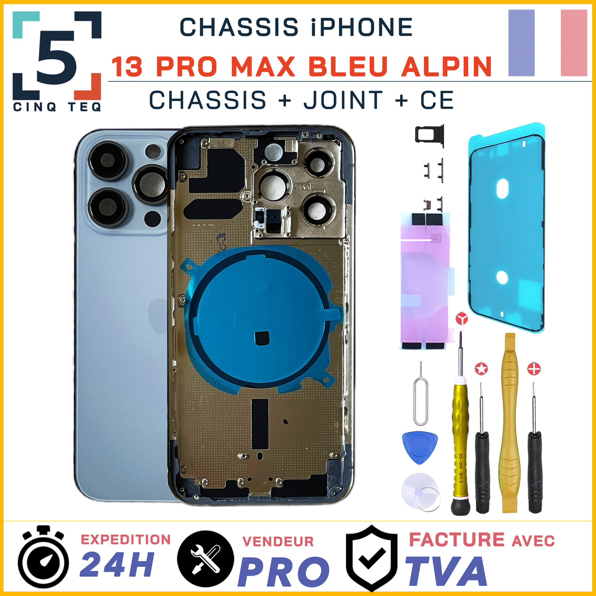 Ce composant permet de remplacer la face arrière endommagée d’un iPhone 13 Pro Max lorsque le châssis est cassé, fissuré ou fortement rayé.