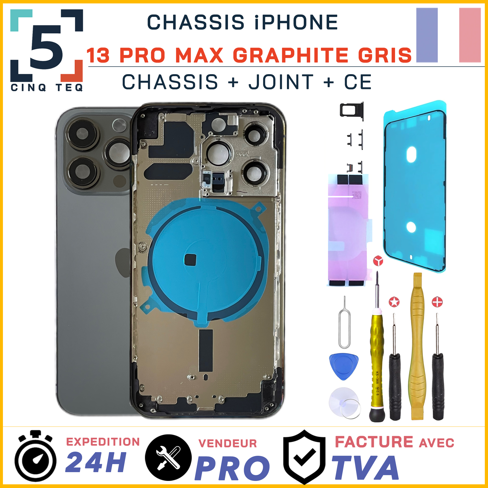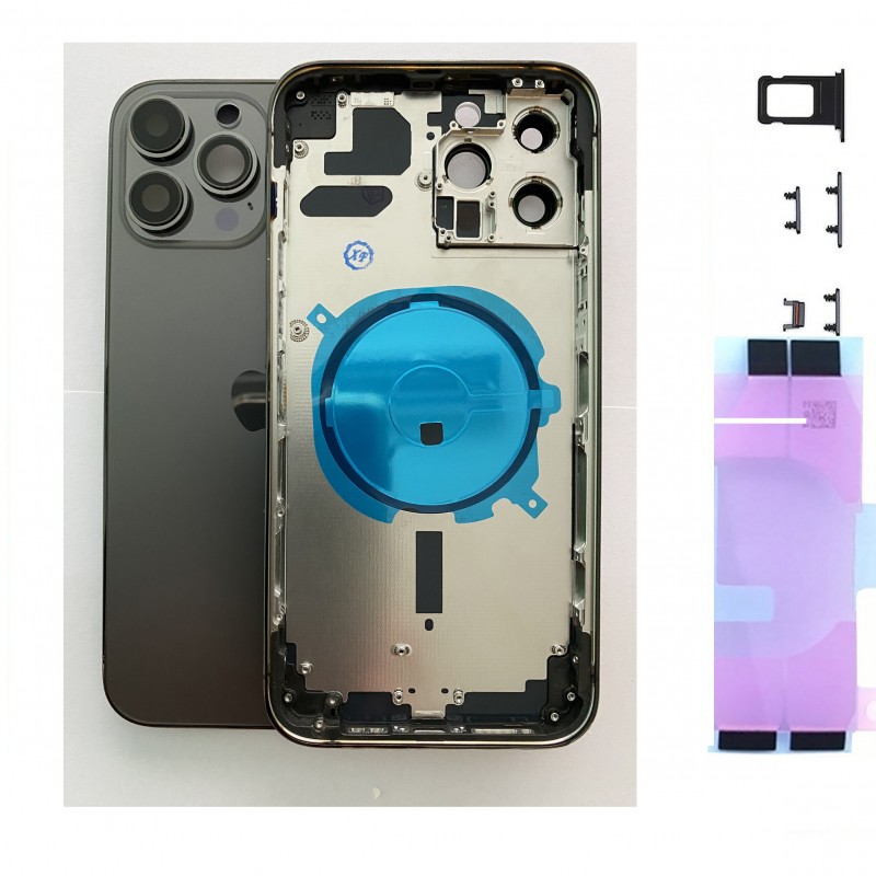 Ce composant permet de remplacer la face arrière endommagée d’un iPhone 13 Pro Max lorsque le châssis est cassé, fissuré ou fortement rayé.
