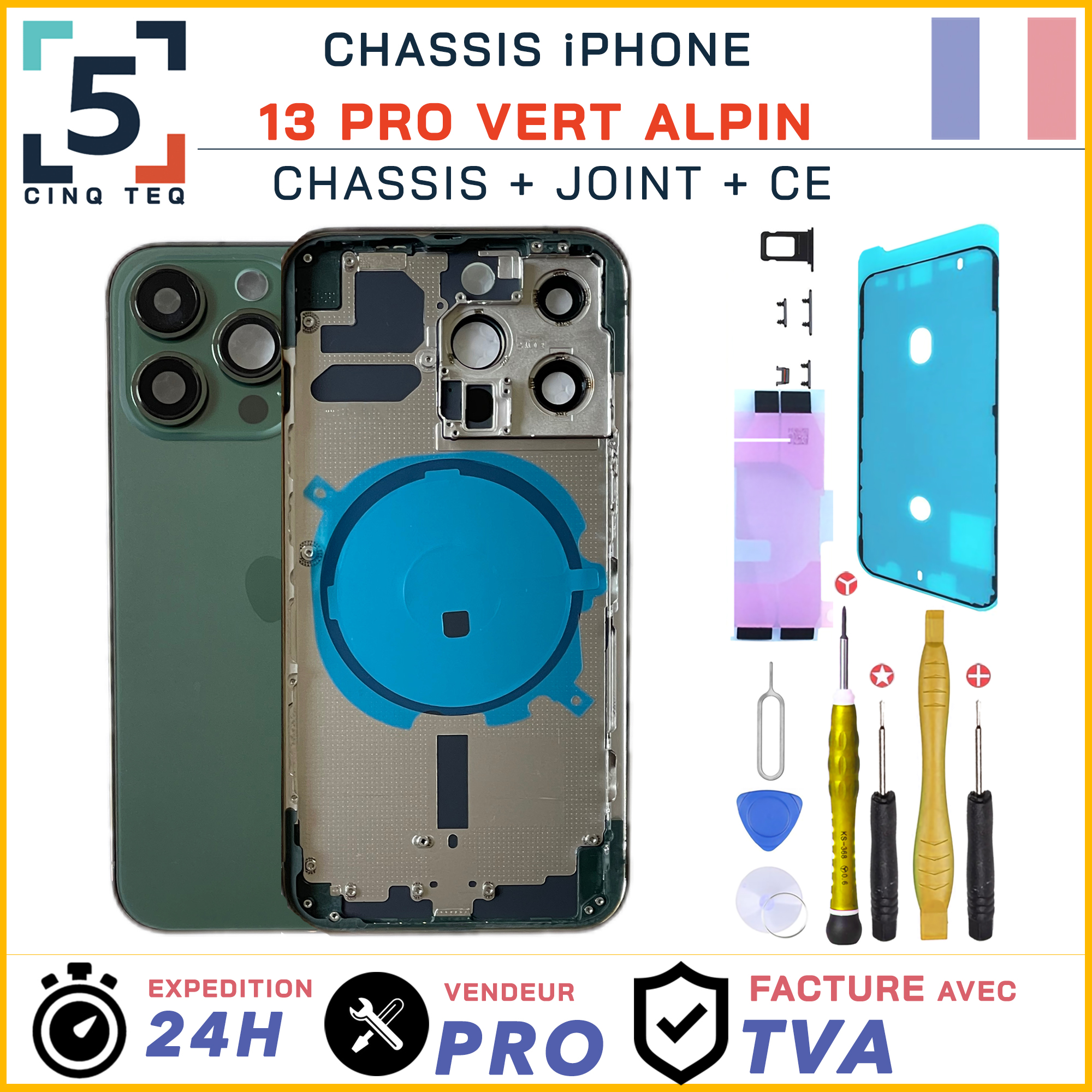 Ce composant permet de remplacer la face arrière endommagée d’un iPhone 13 Pro lorsque le châssis est cassé, fissuré ou fortement rayé.