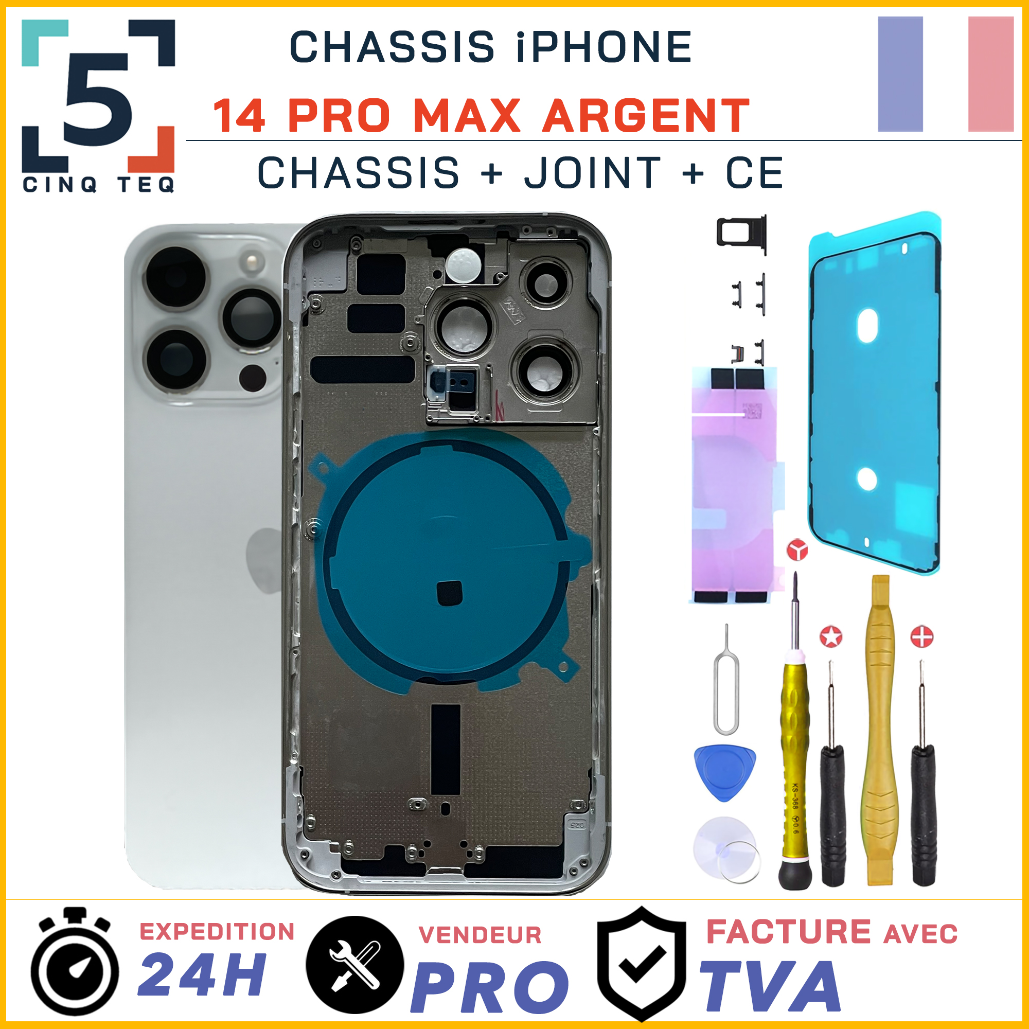 Ce composant permet de remplacer la face arrière endommagée d’un iPhone 14 Pro Max lorsque le châssis est cassé, fissuré ou fortement rayé.