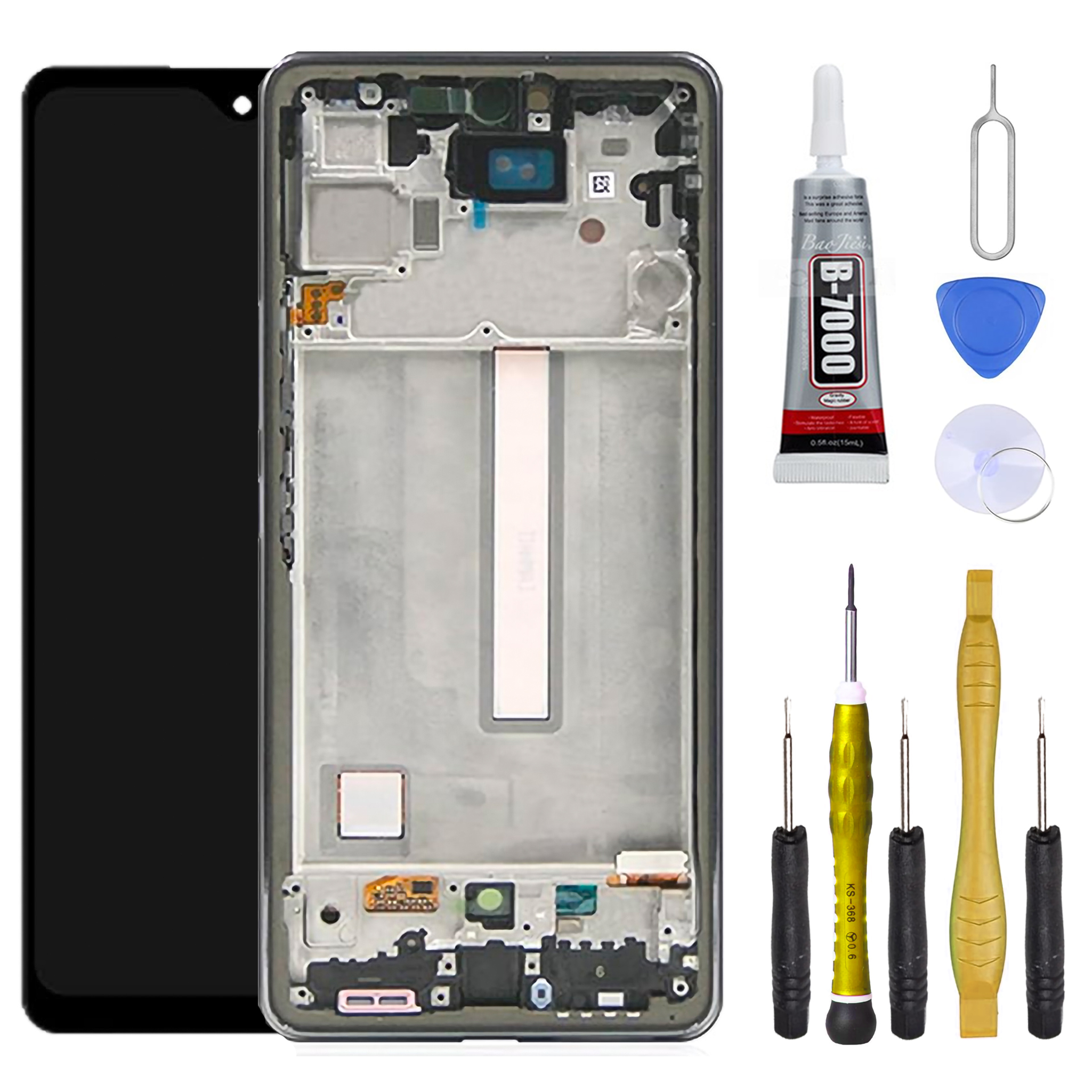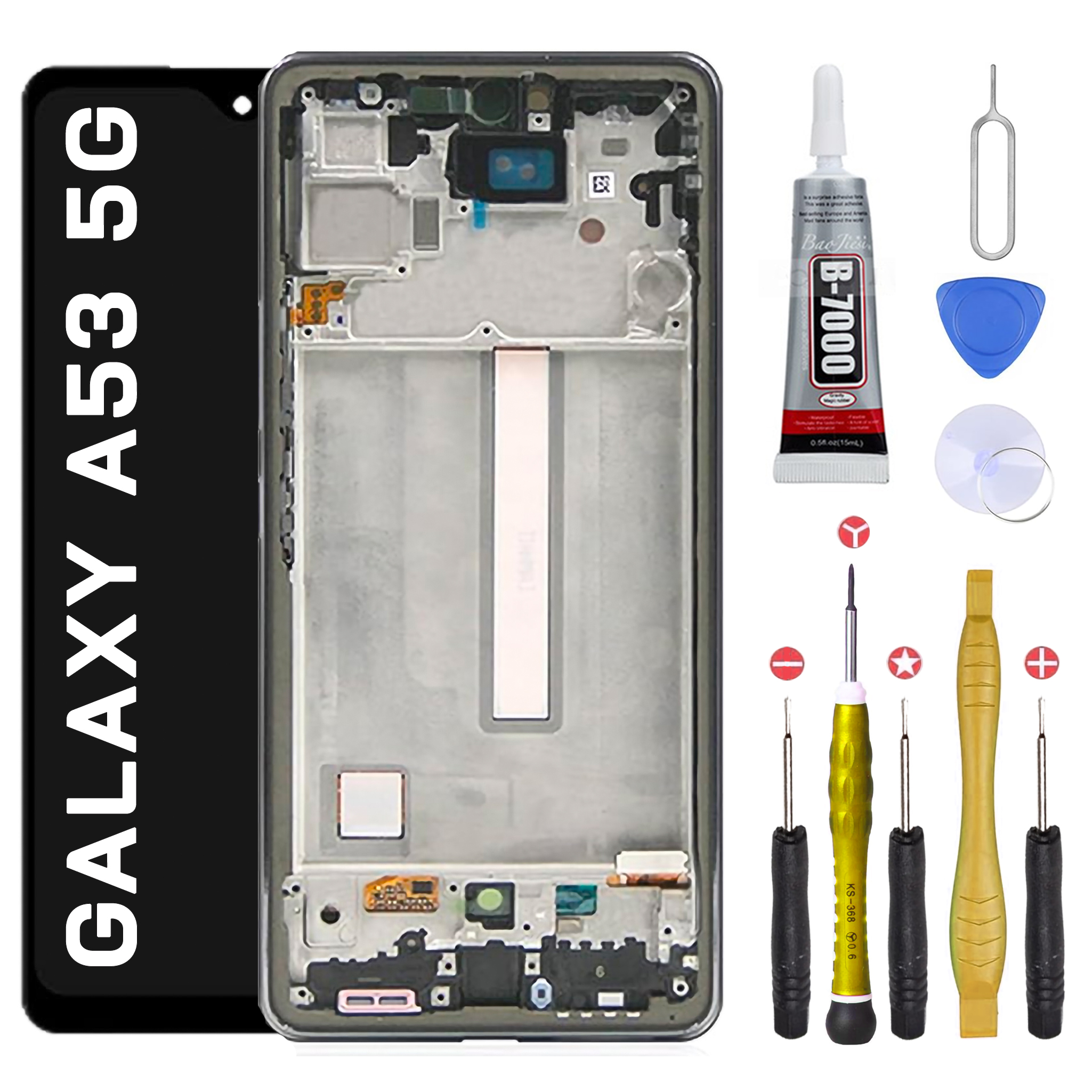 Compatible avec: SAMSUNG GALAXY A53 5G SM-A536B, SM-A536U La colle et les outils pour l’installation sont fournis avec l’écran.